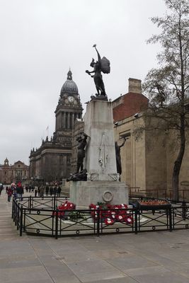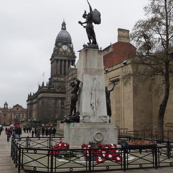 The memorial stands near Leeds Town Hall and City Art Gallery, with multiple public transportation options available for visitors approaching from any direction.