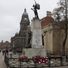 The memorial features a marble obelisk crowned by a bronze angel of peace holding roses, with sculptures of peace and Saint George on opposing sides.