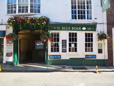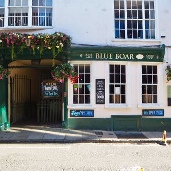 The Blue Boar stands on Castlegate with a distinct 1851 facade featuring a carriage arch that leads to former stables at the rear.