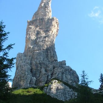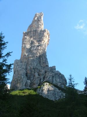 The Campanile di Val Montanaia is a sharp rock needle in the Province of Pordenone that rises steeply from the valley floor. The formation measures roughly 50 to 60 meters wide at its base and extends about 300 meters upward.