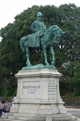 The equestrian statue presents General Sir Redvers Buller mounted on his horse Biffen, cast in bronze weighing 4.5 tons upon a 35-ton Cornish granite base.