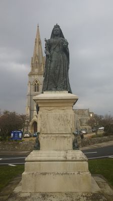The bronze statue of Queen Victoria stands on a Portland stone base near St John's Church, featuring the monarch in ceremonial robes.