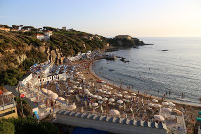 The beach sits between two historic villas: Villa Godilonda, connected to poet D'Annunzio, and the yellow villa owned by actor Marcello Mastroianni.