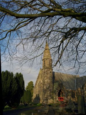 The Church of All Saints exhibits lancet windows, rusticated gritstone ashlar walls, and a Westmorland slate roof alongside a round bell tower.