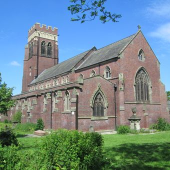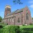 The red and blue brick building features a west tower with eight bells, stone dressings, and a nave comprising six bays with aisles.