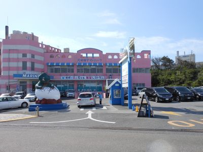 The aquarium featured pink exterior walls, with observation areas overlooking the Pacific Ocean from its hilltop location at the easternmost point of Honshu.