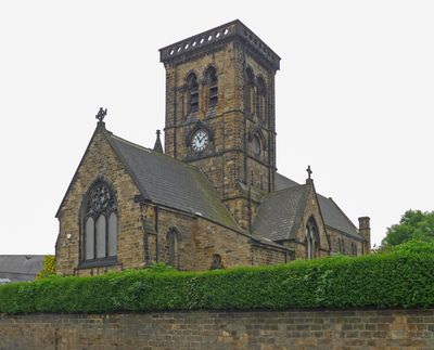 The Church of All Saints features a nave with five bays, coupled lancet windows, and a crossing tower made from hammer-dressed sandstone with a graduated slate roof.