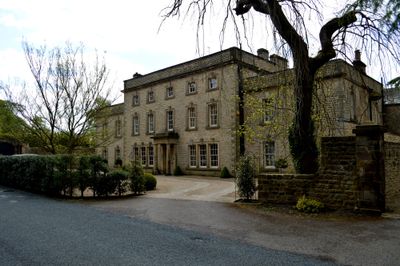 Easby Hall presents a three-story central block with two-story wings constructed from coursed rubble, brick, and ashlar dressings under lead and slate roofs.