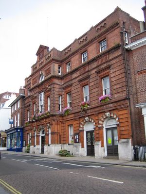 The Grade II listed Town Hall on High Street features an asymmetrical main frontage with multiple bays and a preserved Georgian staircase from its earlier structure.