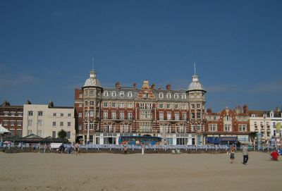 The Royal Hotel and Queens Ballroom stands as a red brick structure with Portland stone elements, overlooking Weymouth Beach and Weymouth Bay in Dorset.