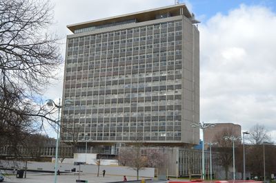 The Plymouth Civic Centre features a 14-floor modernist tower block positioned along Armada Way, connecting major urban spaces within the city center.