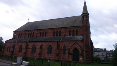 The red brick building with stone dressings features angled buttresses and a steep slate roof covering both the nave and chancel sections.