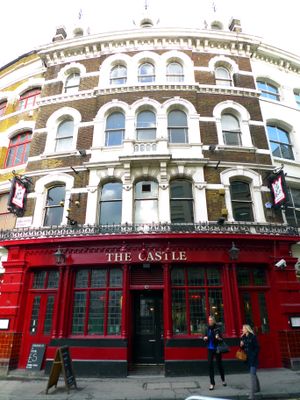 The Castle Public House stands as a two-story brick building with preserved Victorian architectural elements and traditional pub features in north London.