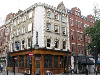 The Champion Public House stands at the intersection of Wells Street and Eastcastle Street, featuring traditional architectural elements and a classic British pub interior.