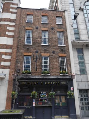 The Hoop and Grapes is a listed pub on Aldgate High Street featuring a distinctive wooden frontage and architectural details from the late 1600s. The interior contains multiple rooms with a narrow, traditional layout that reflects how drinking establishments were built during this period.
