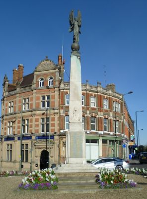 The New Barnet War Memorial features a bronze figure of winged victory holding a palm leaf on a globe atop a Portland stone obelisk.