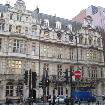 This Grade II building at High Holborn features a Portland stone facade with Corinthian pilasters, arched entrances, and oriel windows on upper floors.
