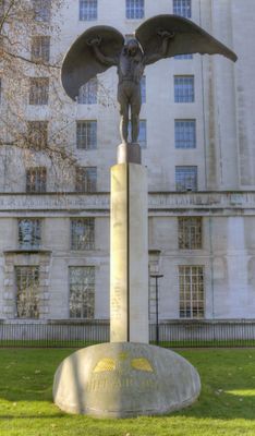 The Fleet Air Arm Memorial is a monument in Victoria Embankment Gardens featuring a stone column topped with a bronze figure wearing a flight suit and helmet with extended wings. The memorial stands situated between the River Thames and the Ministry of Defence headquarters in central London.
