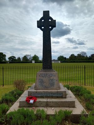 The memorial features a stone wheel-head cross on a tapering shaft, mounted on a square plinth with three-stepped base at the intersection of roads.