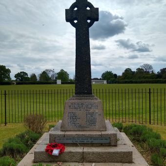Cockfosters War Memorial, War memorial with Celtic cross at Chalk Lane junction, London Borough of Enfield, England.
