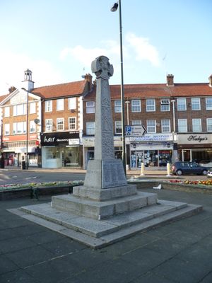 The East Barnet War Memorial features a Celtic cross made of Portland stone with a bronze figure representing victory holding a palm leaf on a globe.