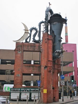 The National Lottery, Manchester City Council, and Northern Quarter Association funded this gateway sculpture to represent the growing artistic district of Manchester.