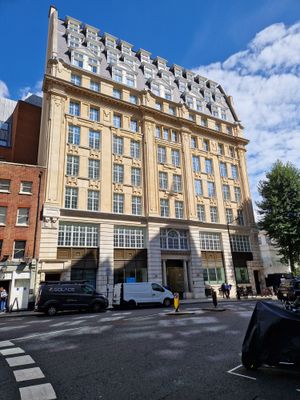 The nine-floor structure at 54 Broadway features a mansard roof and stands near St James's Park Underground station in central London.