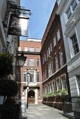 A stone bust and plaque reading 'This is Devereux Court, 1676' commemorate Robert Devereux, the Second Earl of Essex, who once held land here. These markers serve as a direct link to the street's past.