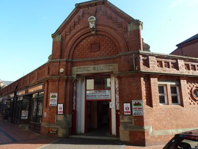 The market hall reflects Victorian public architecture through its stone exterior, slate roof, and segmental arched entrance with decorative pedimented window heads.