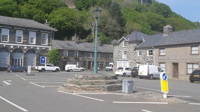 Steps and lamp post at centre of Market Square, Grade II listed building in Gwynedd. In the centre of the Market Square.