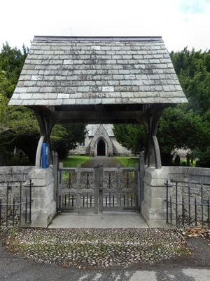 Lychgate at Holy Trinity Church, Grade II listed building in Trefnant. Prominently located on the roadside in front of the church and set into the stone churchyard boundary wall.