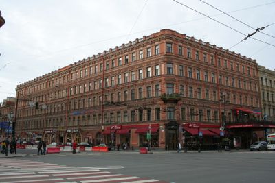 Located at the intersection of Nevsky and Vladimirsky Prospects, the building maintains its original facade design with nineteen distinct architectural bays.