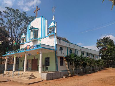 The church grounds contain multiple prayer areas, including a Lourdes Grotto with a four-foot statue of St. Mary on Mallikarjuna mountain.