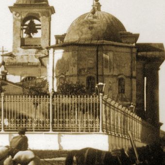 The Saint Anastasia church displays white exterior walls with neo-Byzantine architectural elements, featuring detailed ornamental designs throughout its structure.