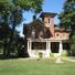 The Thomas A. Beach House features triple-thick brick walls, a central tower, double bracketed eaves, and tall slender windows across its two-story structure.