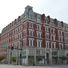 The five-story brick building features a prominent tower at its northeast corner and a mansard roof with large semicircular arched openings.