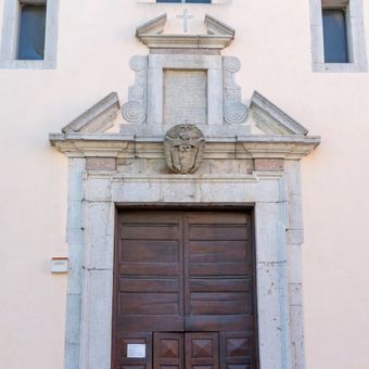 The church entrance displays a princely coat of arms of the Tocco family on its limestone portal, accessed by four steps.