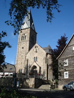 The St. Laurentius Church stands on an elevated plateau in the center of Kalbach, featuring high round-arched windows and a steep slate roof with a tower.