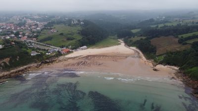 The beach extends 400 meters in length and 70 meters in width, featuring golden sand and moderate waves along the Cantabrian Sea.
