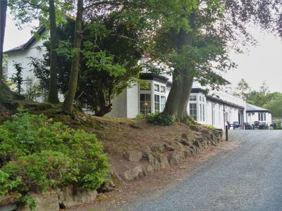 The Regency building from 1835 features cast iron veranda and balcony designs, standing within landscaped gardens near Lake Windermere.