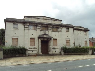 The three-story Portland limestone structure stands at the junction of Headingley Lane and Richmond Road, featuring Egyptian Revival architectural elements.