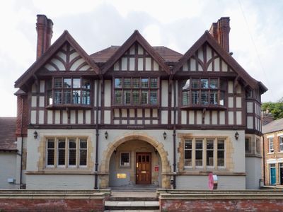 The two-story brick building features timber framing, a tiled roof with gabled bays, and a half-octagonal tower on its right side.