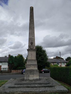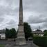 The memorial features a tall obelisk constructed from local stone, rising above a molded pedestal with three shallow steps at its base.