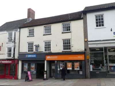 Nos. 19 & 20 High Street, Grade II listed building in Chepstow. High Street has ascending numbers downhill on S side to Beaufort Square, then uphill from number 24 on N side