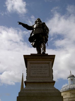 The bronze statue depicts Admiral Robert Blake in parliamentary soldier attire, with his right arm extended and holding a sword on a brick platform.