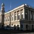 The neoclassical structure on Lind Street features a symmetrical main block with five bays, Doric columns, and a prominent clock tower added in 1867.