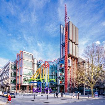 The headquarters of Channel 4 consists of two L-shaped four-story office wings connected by a curved section that aligns with the plot configuration.