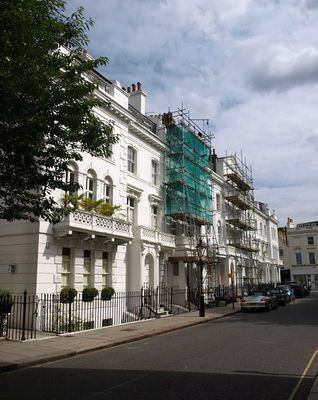 The surrounding properties maintain their original Victorian architectural elements, including decorative cornices, sash windows, and detailed stone carvings.