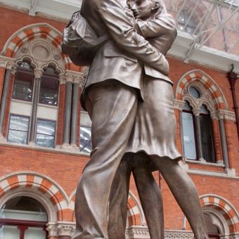 The Meeting Place is a bronze sculpture in the main hall of St Pancras railway station in London. The two embracing figures stand on a granite base and rise 9 meters (30 feet) into the air.