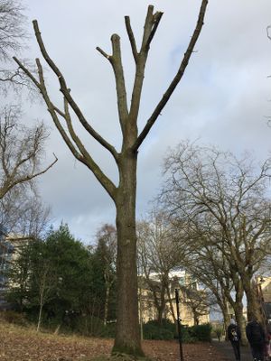 Standing in Kelvingrove Park, the large oak tree reaches toward the sky with branches spreading wide across the green space near Glasgow University.